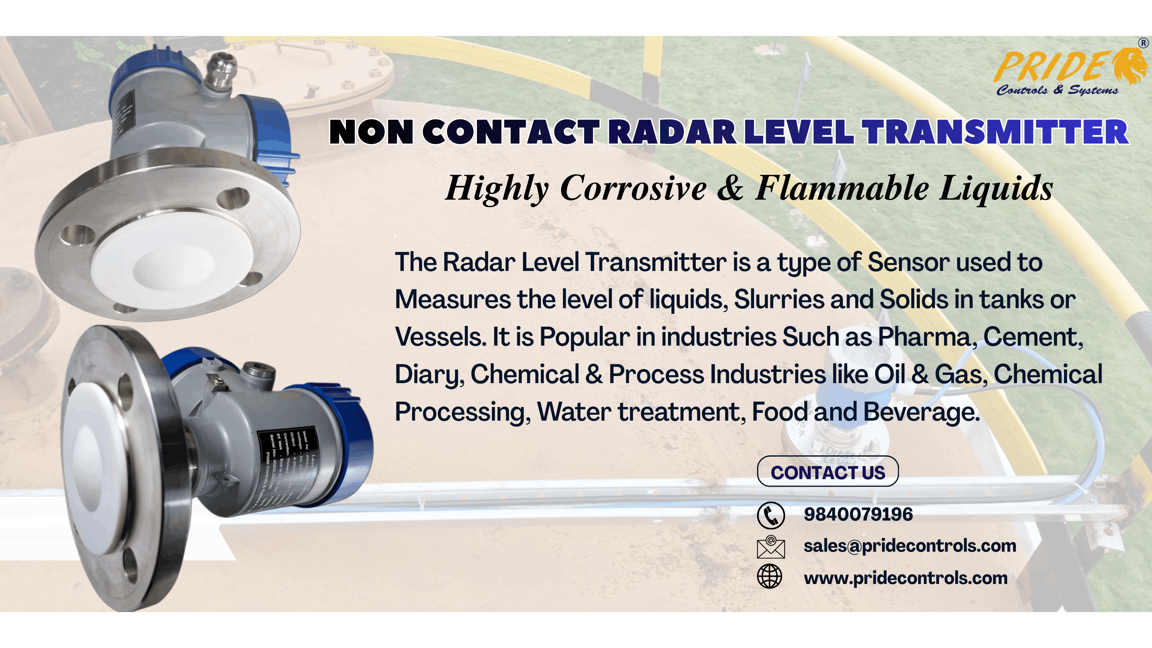 PRIDE Radar level transmitter is a type of sensor used to measure the level of liquids, slurries, and solids in tanks or vessels. It utilizes radar technology to determine the distance from the sensor to the surface of the material being measured. Radar level transmitters are popular in industries such as Pharma, Cement, Dairy, Chemical & process industries oil and gas, chemical processing, water treatment, and food and beverage production, where accurate and reliable level measurement is essential for process efficiency and safety. They offer advantages such as non-contact measurement, high accuracy, and suitability for various operating conditions, including high temperatures and pressures.
