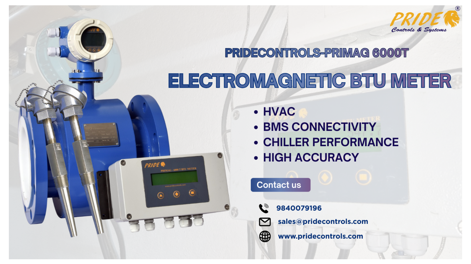 Pride Controls & Systems Pvt Ltd is a certified manufacturing company under ISO 9001:2015, specializing in the production of high-performance industrial flow measuring instruments. The PRIDE PRI-MAG 6000-T Electromagnetic BTU Meter is a high-performance device specifically engineered to monitor the usage and performance of liquid cooling and heating transfer applications, such as chillers, air handling units (AHUs), and thermic fluid heat transfer. This device integrates an electromagnetic flowmeter with a pair of temperature sensors to accurately measure BTU. With the PRIDE PRI-MAG 6000T BTU Meter, users can effectively monitor and measure all the necessary data involved in HVAC parameters, including energy consumption, current flow, total flow, inlet temperature, outlet temperature, temperature difference in consumption, energy units consumed, and more. Its advanced capabilities make it an ideal solution for businesses and academic institutions seeking precise and reliable data for their liquid cooling and heating transfer applications.