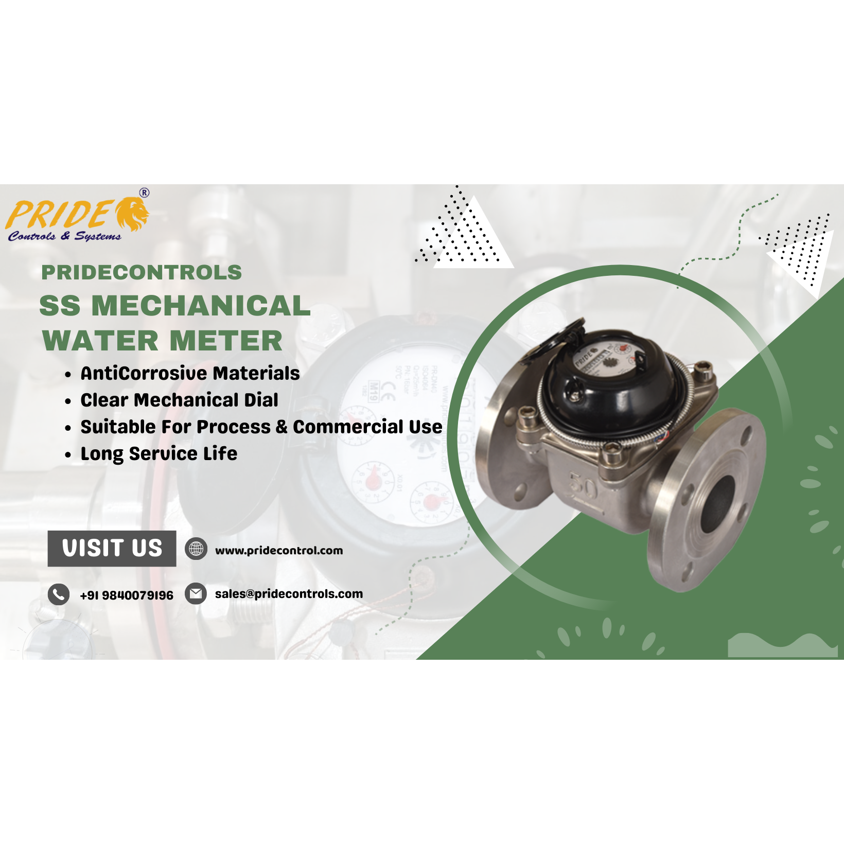 Pride Controls & Systems Pvt. Ltd is a Chennai-based manufacturing company that is certified under the ISO 9001:2015 standard. Our area of specialization lies in the production and exportation of high-quality industrial flow and level measuring instruments. Our flagship product, the Pride SS316 Watermeter, is a mechanical water flow meter that stands out for its superior quality and performance. It is available in DN50 to DN300 sizes and is made with food-grade materials. Our Watermeter are designed in Germany to ensure high accuracy and low pressure drop. Thanks to the vacuum-sealed register, the flow measurement is exceptionally smooth. We offer various end connections, including screwed, flanged, and sanitary connections, to cater to diverse customer needs.