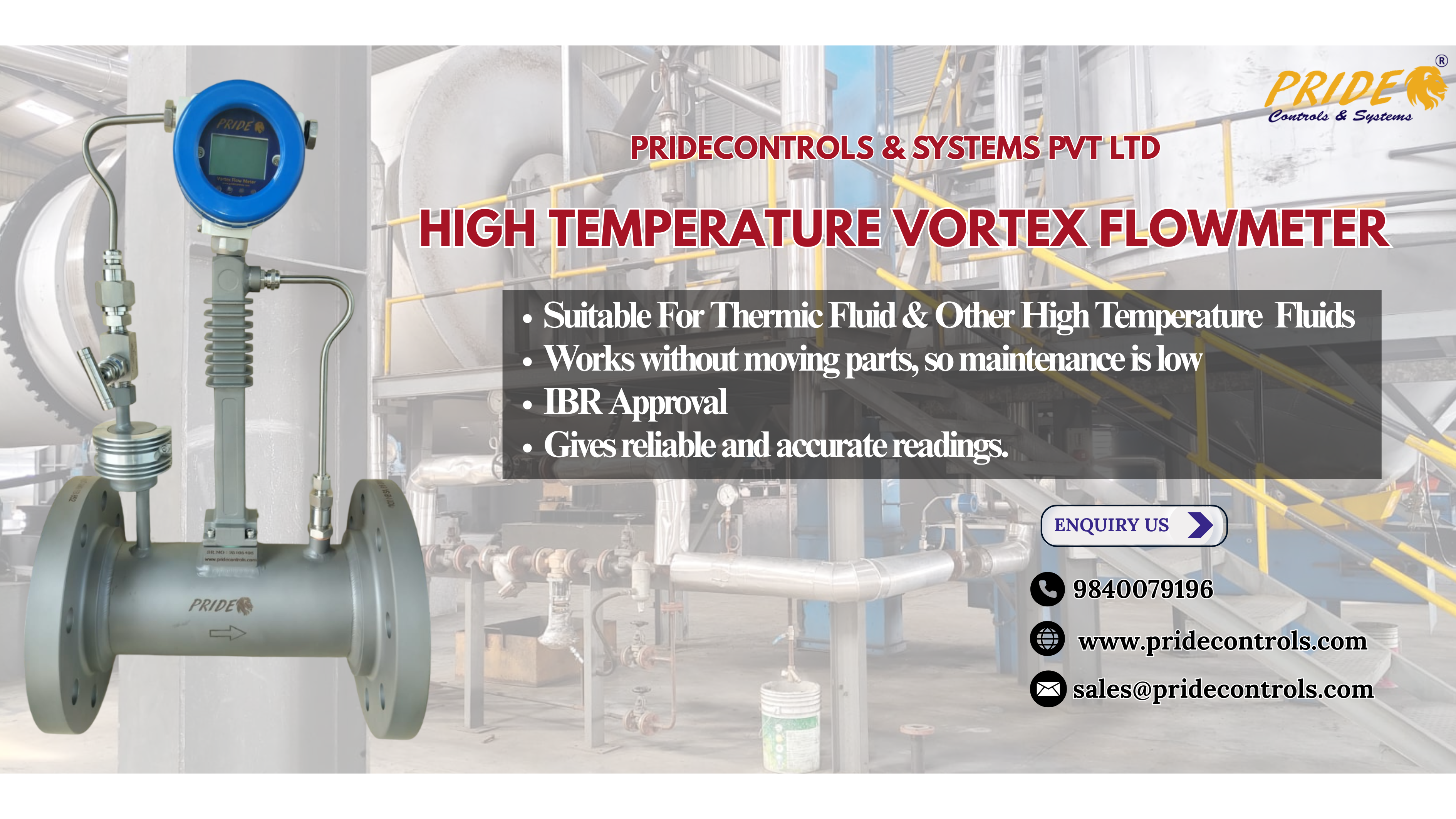 Pride Controls & Systems Pvt. Ltd is an ISO 9001:2015 Certified Manufacturer of Flowmeter, Suppliers and Exporters of the Air, Steam and Gas Type Approved of High Temperature Version Vortex Flow meter. Our professionals design flowmeters that meet global quality standards using top-notch technology and materials. It is suitable for Dry Gas, Wet Gas, and Mixture of gases. And our product are more specifically used in Bio gas Industry also. The Vortex and shedding frequency of the fluid is proportional to the flow velocity. It measures mass flow, Volumetric Flow, Pressure, and temperature. It is resistant to corrosion, pressure, and temperature. This Flow meter is Easy Installation and Maintenance Free Design.